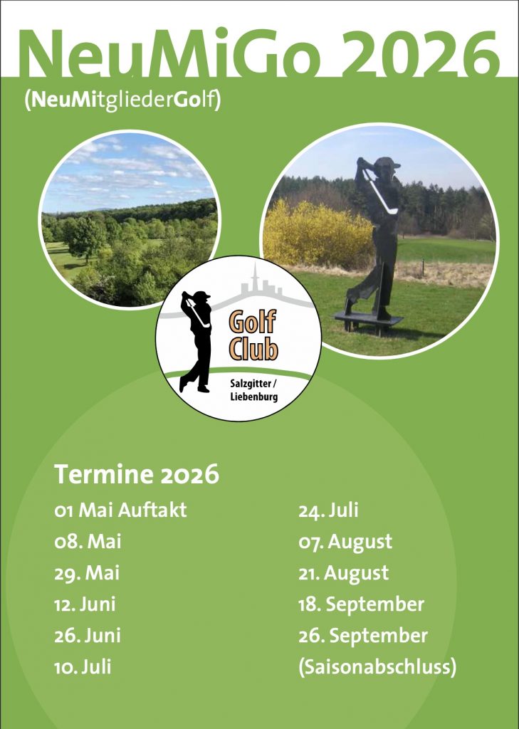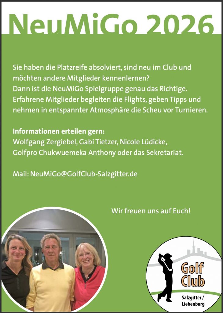 Neu in dieser Saison: Beim vorgabewirksamen NeuMiGo-Turnier werden ausschließlich Spielerinnen und Spieler mit einem Handicap von 54 bis 43 gewertet und können vorgabewirksam spielen. Alle anderen sind herzlich eingeladen, als Helfer teilzunehmen und die Neulinge unterstützend zu begleiten.